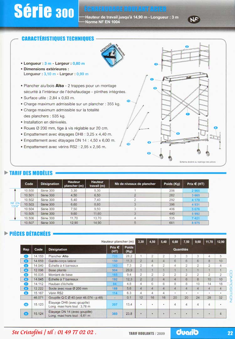 les échafaudages aluminium, échafaudage aluminium Comabi duarib , prix des échafaudages aluminium comabi duarib sont visibles dans le catalogue duarib ainsi que les prix des échafaudages aluminium mais aussi les prix des échafaudages acier pour façade donc pour façadier, pour peintre, pour maçon, pour couvreur, dans toutes les hauteurs. Les échafaudages fixes R200 sont aux nouvelles normes européennes EN12810 et 12811 conforme au décrêt 01/09/2004. Nous vous proposons des échafaudages aluminium starlium idéal pour un travail en façade ou sous plafond, les géréris en acier, hauteur plateau 6 mètre, -6 m, 7 mètres, 7 m, 8 m, 8 mètres, 9 m, 9 mètres, 10 m, 10 mètres, 11 m, 11 metres, 12 métres, 12 m, 13 m, 13 métres, 14 m, 14 mètres, 15 m, 15 mètres, 16 m, 16 mètres, 17 m, 17 mètres, 18 m, 18 mètres. Vous trouverez également des gazelles ou tétris, socles à vis articulé pour départ d'échafaudage, filets de protection, des colliers orientables, amarrges chevilles, amarrage vérins, plancher alu, plancher alu-bois, placher acier. La tour escalier 3 m x 1.50 mètres de large de type solidium, des monte-matérieux pour couvreur, plaquiste, pour maçon à des prix très intéressants.