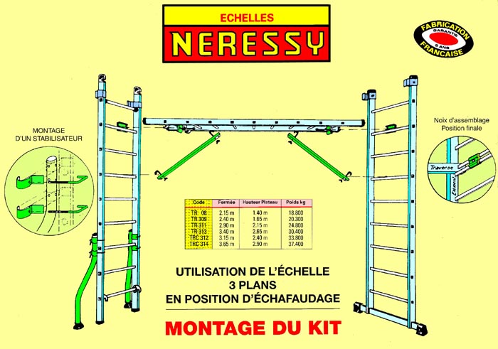 Ce site vous permet en passant par l index et l accueil , de voir les echelles transformables ainsi que les echelles a coulisse . Les echelles de toit sont tres demandées grace a leurs crochets. Escabeaux, echelle articulee et marchepieds de 3 a 12 marches sont tres robuste. les petits echafaudages aluminium et les grands echafaudages aux normes Europeennes et AFNOR avec les details de verrous automatiques de garde-corps, de manchons, de traverses, de plateaux, de roues standards, de roues de rattrapage de niveau, de pieds de stabilisations grands modeles et petits modeles, et tous les accessoires de securites vous rassureront. le special stabilisateur universel avec de nombreuses photos est adaptable sur toutes les echelles, Les plate-formes de securite sont presentées. De multiples videos sequentielles vous feront voir divers montages( 3 plans, pmr, transport, escabeaux, stabilisateurs genoux et page vidéo generale), La page prix et la page bon de commande vous donneront la marche a suivre pour commander en vente directe .pour les échelles télescopiques comme pour l' échelle de grenier ou escalier escamotable